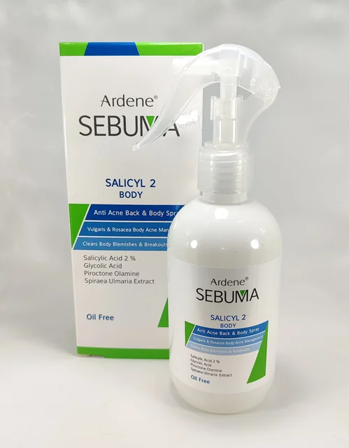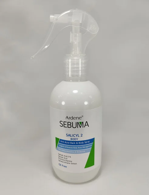 اسپری ضد جوش بدن آردن سبوما دارای پیروکتون اولامین و عصاره جای سبز بوده و موجب تنظیم ترشح چربی و رفع سبوم اضافی پوست میشود. به علاوه این اسپری توسط اسید سالیسیلیک و اسید گلیکولیک لایه برداری قوی و تخریب لایه شاخی و فرسوده پوست را باعث میشود.