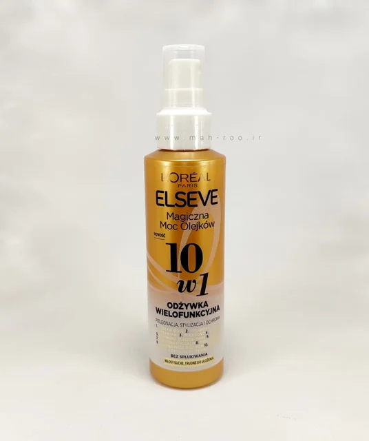 اسپری مو ده کاره معجزه گر لورآل L’Oréal Paris Elseve 10w1 (Odżywka Wielofunkcyjna) یک نرمکننده چندکاره بدون نیاز به آبکشی از لاین روغنهای مغذی است که برای موهای خشک، وز و آسیب دیده طراحی شده. این محصول همزمان سه نقش مراقبت، حالتدهی و محافظت را انجام میدهد و براساس تستهای ابزاری برند، ده مزیت کلیدی ارائه میکند: