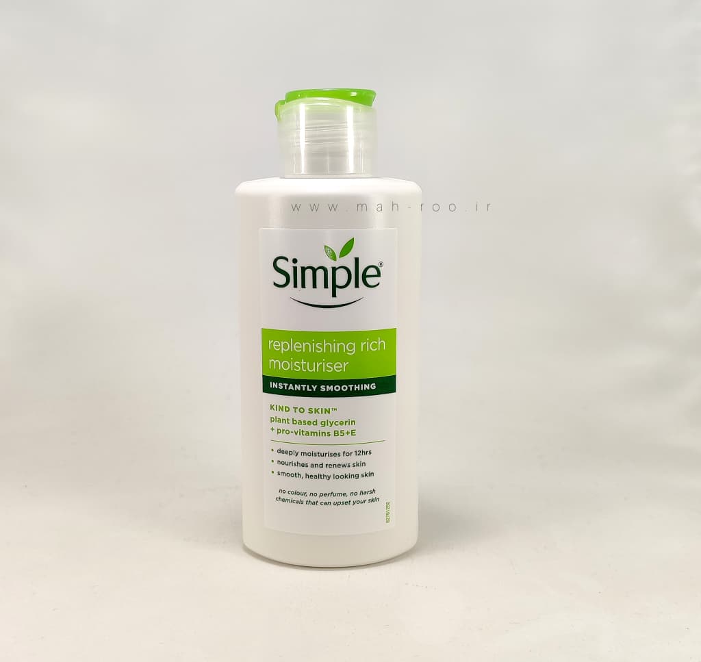 کرم آبرسان سیمپل ریچ Simple Replenishing Rich Moisturiser یکی از محصولات پرطرفدار برند انگلیسی سیمپل است که با فرمولاسیونی ساده، ایمن و کاملاً مغذی، برای پوستهای خشک و حساس طراحی شده است. این کرم بافتی نرم و کرمی دارد که به سرعت جذب پوست میشود و بدون ایجاد چربی یا سنگینی، رطوبت عمیقی به پوست میرساند.